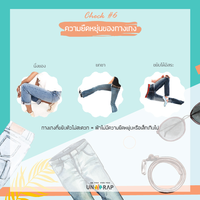 แล้วจะรู้ได้ยังไงว่ายีนส์ตัวนี้ขยับตัวสะดวกหรือป่าว มีวิธีการง่ายๆในการเช็คอยู่ แค่ลองนั่งยองๆ ยกขา ลองขยับแบบอิสระตามที่ต้องการ แค่นี้ก็จะรู้แล้วว่ายีนส์ตัวนี้ยืดหยุ่นหรือพอดีสำหรับเราหรือป่าว